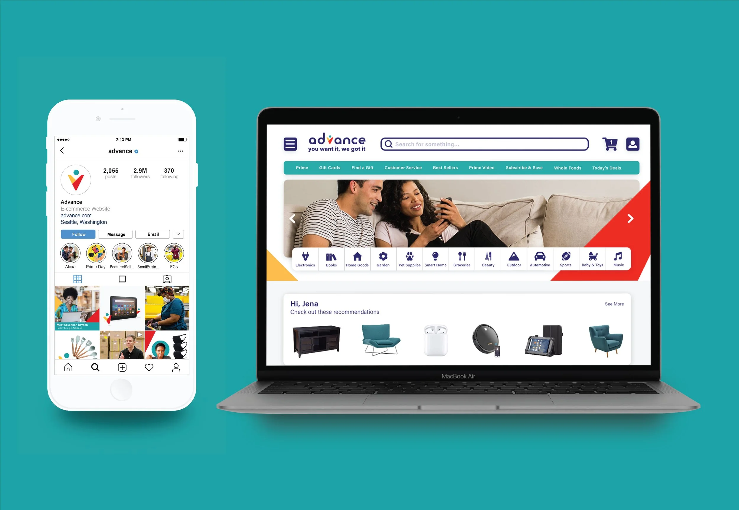 I designed the imaginary rebranding of Amazon into Advance: the world’s most customer-centric e-commerce company. This challenged to me to translate new company values into brand identity across web design, digital marketing, and print materials.